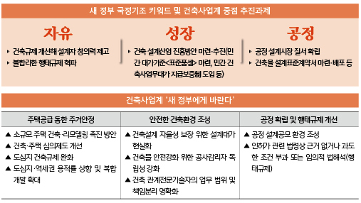 새 정부가 5월 10일 출범했다. 윤석열 대통령은 취임사에서 ‘자유의 가치’를 수차례 언급, 11일 첫 수석비서관 회의에서도 국정 운영에 있어 민간 자율을 최대한 존중하면서 어쩔 수 없을 때만 정부가 개입하겠다는 뜻을 내비친 가운데, 새 정부 정책변화에 따른 건축사업계의 기대감도 그만큼 높다. 새 정부 국정기조에 부합한 건축정책 방향에 대한 제언을 최근 대한건축사협회가 각 정당과 맺은 업무협약과 더불어 협회가 추진 중인 정책에 근거해 살펴본다.
