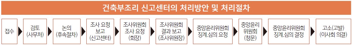 관련 규정에 따라 센터는 조사위원회와 협력해 신고사항의 사실 조사·확인을 하며, 부조리 행위나 관계 법령 위반행위에 해당되면, 협회에 징계·심의 요청을 하고, 협회는 이사회 의결로 해당자를 관계기관에 고소·고발·징계 요청, 시정 조치를 하게 된다. 신고사항에 대한 법률적 검토가 필요할 땐 자문변호사로부터 법률자문 도움을 받는다.