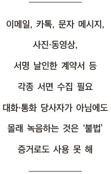 또 하나, 전화통화 녹음이나 커피숍이나 사무실에서의 대화 녹음도 훌륭한 증거가 됩니다. 우리나라에서는 (미국 등 몇몇 나라와 달리) 대화 상대방에게 녹음 사실을 알리지 않은 경우에도 녹음을 하는 사람이 그 대화 당사자의 일원인 경우에는 적법하게 보고 있고, 그 녹음의 증거능력도 인정해 줍니다. 유의하실 것은 자신이 대화나 통화의 당사자가 아님에도, 대화 당사자들 몰래 그 대화를 녹음하는 것은 이른바 ‘도청’에 해당하여 중대한 형사처벌 대상이고, 그 녹음은 증거로도 사용하지 못합니다. 예를 들어 유선 전화기 속에 감청장치를 부착하여 다른 사람들의 대화를 녹음하는 것, 또는 사무실 테이블 밑에 도청기를 장착해 두고, 자신은 대화에 끼지 않고 밖에 있으면서 사무실 테이블에 모여 앉아 대화하는 사람들의 말을 녹음하는 행위 등이 도청에 해당하는 것입니다.