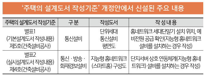 주택법 하위 행정규칙인 ‘주택의 설계도서 작성기준’ 개정안이 6월 20일 고시돼 같은 날 시행된다. 개정안은 별표1(기본설계도서 작성내용)과 별표2(실시설계도서 작성내용)에 지능형 홈 네트워크 설비 서류를 포함시키는 내용을 담고 있다.