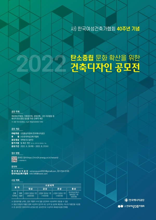 문의는 한국에너지공단(newzeroward2022@gmail.com, [공모전 사무국]02-734-3105), 한국여성건축가협회(kifa1340@naver.com) 등으로 하면 된다.