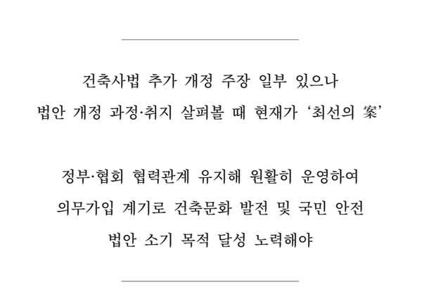 건축사법 개정안을 지금 다시 개정하더라도 현 개정안보다 더 좋은 안으로 개정하기는 어렵다고 판단한다. 어려웠던 상황에서 최선의 방안이 만들어진 것이며 앞으로 정부와 협회가 협력관계를 유지하면서 원활히 운영하여 개정 배경에서 말하는 것처럼 의무가입을 계기로 건축문화가 발전하고, 설계하고 짓고 부수는 일련의 건축 과정에서 국민의 안전이 더욱 보장되었으면 한다.