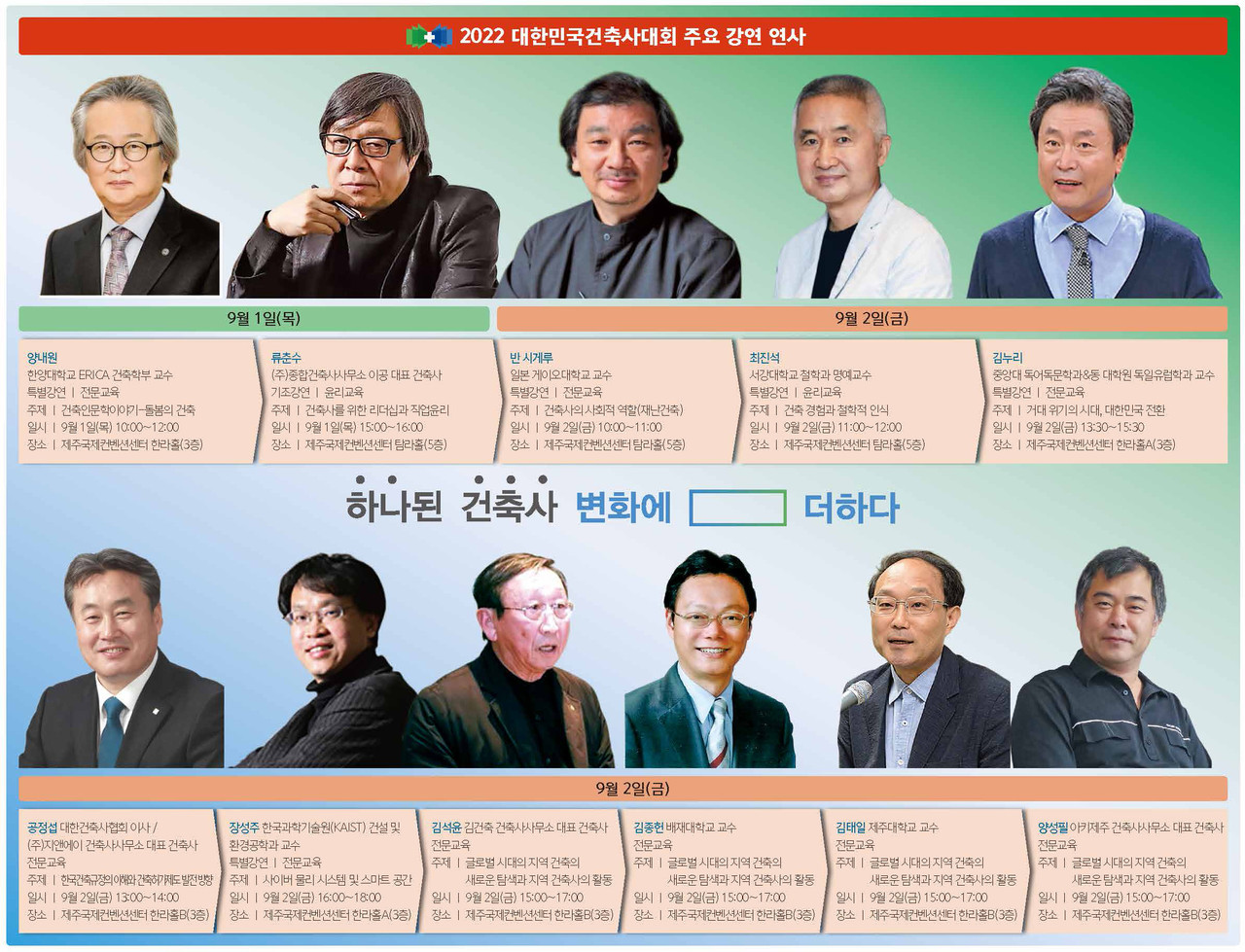 오는 9월 제주에서 열리는 2022대한민국건축사대회는 건축 분야 국내외 인플루언서, 연사들이 사회·정치·교육·철학·리더십 등에서 탁월한 통찰력을 보여주고, 건축현안에 대한 진단·해법과 더불어 과거와 현재를 잇는 제주건축의 이야기를 직접 들려줄 예정이다.