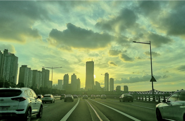 여름을 맞이 할 때면 대기의 흐름의 변동으로 장마가 옵니다. 새로운 무언가를 맞이하고 이루려고 하면 항상 시련을 극복하게 만드는 세상의 이치인 듯 자연도 마찬가지로 계절이 바뀔 때면 그 변화를 알리듯 천둥 번개를 동반한 폭우를 내립니다. 이 장마를 온몸으로 맞이하여 지내고 나면 자연은 더욱 생명력을 얻게 됩니다. 폭우가 내린 후 해질 무렵, 먹구름이 개여 가는 하늘을 바라보며 달리는 올림픽대로의 모습은 시련 뒤에 맑은 내일을 알려주는 신호처럼 묘한 희열감을 느끼게 해 줍니다.