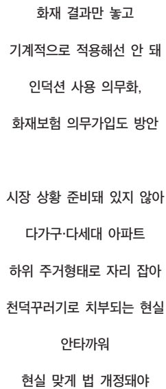 간이스프링클러를 적용하는 것도 현실적으로 어렵다. 장비도 고가이고 소형 주택에서 설치 장소를 만들어내기도 쉽지 않다. 창의 개수를 줄이게 되면 환기나 채광에 문제가 생길 터이고, 방화창을 설치하자니 단열이나 결로가 걱정되는 상황이다. 거주환경이 좀 안 좋아져도 어쩌다 발생할 수 있는 화재의 확산에 대한 대비가 중요하니 좀 참고 살라고 강요하는 법이 아닐 수 없다.
