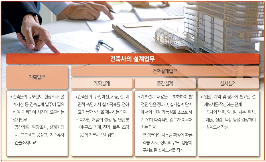 건축사 업무는 크게 ▲건축설계 ▲공사감리 ▲설계의도 구현 등으로 구분된다. 이 중에서 ‘건축설계’는 건축사의 고유업무로서 핵심이다. 설계업무는 다시 ▲기획업무 ▲계획설계 ▲중간설계 ▲실시설계 ▲사후설계관리업무 등으로 나뉜다. 가령 공간계획, 현장조사, 설계지침서, 프로젝트 공정표, 기존유사건물조사비교(기획업무)를 한 후 이를 좀 더 구체화하는 게 ‘계획설계’다. 디자인 개념의 설정 및 구조·기계·전기·토목·조경 등 연관분야 기본시스템이 검토된 계획안을 말하는데, 건축물의 외관 디자인과 각 실의 면적·위치, 주차장 규모, 엘리베이터·계단 위치 등을 세부적으로 결정한다.