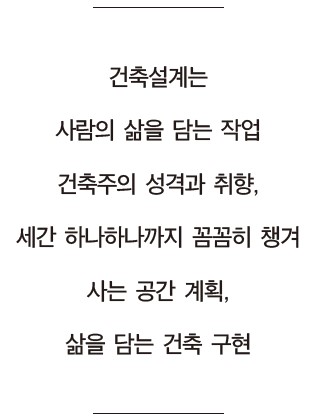 흔히들 집은 ‘사는 사람의 삶’을 닮는다고 한다. 집짓기의 시작, 건축설계를 한다는 것은 곧 그 사람의 삶을 담는 작업이다. 건축주의 성격과 취향, 세간 하나하나까지 꼼꼼히 챙겨 지금까지 살아온 삶의 흔적을 녹여내고, 앞으로의 인생을 그릴 터전을 만드는 일이기 때문이다. 그런 만큼 ‘설계’는 집을 짓는 데 있어 가장 공을 들여야 한다. 사용자의 숨결이 스며들게 하기 위한 매우 중요한 작업인 셈이다. 설계에 문제가 있으면 아무리 우수한 시공사(건설사업자)가 공사해도 절대 좋은 나만의 집, 건축물이 나올 수 없다.