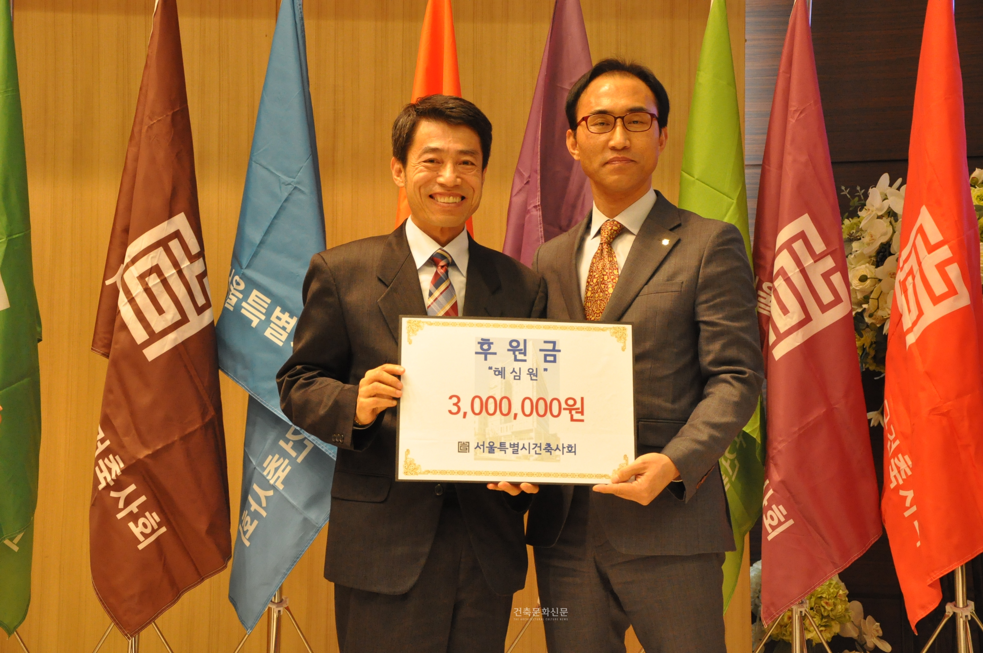 서울특별시건축사회는 지난 12월 19일 ‘2014서울건축사 송년의 밤’ 행사를 건축사회관 대강당에서 개최했다. 이날 송년의 밤에는 기념식 및 후원금 전달식으로 건축사 및 협회의 사회봉사활동 참여를 알리고 회원 간의 친목 도모 및 대내외 건축계 인사와의 교류의 장이 되었으며, 이어서 ‘100세 시대의 자산관리’란 주제로 진행된 강창희 트러스톤연금교육포럼 대표의 특강은 예년의 문화 공연과 달리한 신선한 프로그램 이였다고 참가자들로부터 많은 호평을 받았다.