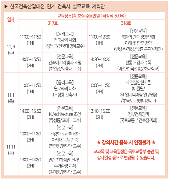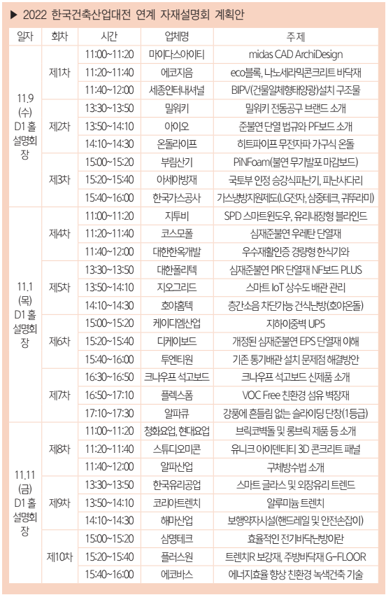 이번 전시회에서는 건축사 실무교육도 추진된다. 지난 전시회에서는 코로나19 확산 방지 이유로 실무교육이 이뤄지지 못했다. 올해는 전문교육 8과목과 함께 윤리교육 2과목이 코엑스 컨퍼런스룸 317, 318호에서 진행된다. B2B와 B2G 형태로 이뤄지는 건축전문 전시회답게 건축자재 설명회도 전시장 내 ‘한국건축산업대전 건축자재 설명회장’에서 열린다. 첫날 오전 11시 1차 교육을 시작으로 11일 금요일 제10차 교육까지 30개 기업들의 설명회가 계획돼 있다. 설명회 진행 업체와 주제, 시간 등은 행사장 내 설명회장 입구·방송으로도 안내될 예정이다.