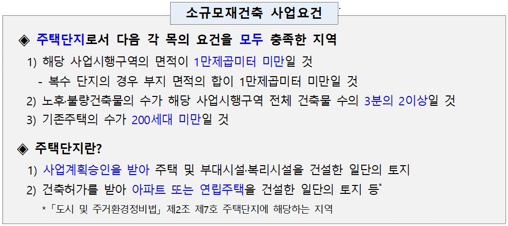 ‘소규모재건축’ 사업은 정비기반시설이 양호한 지역에서 작은 규모로 공동주택을 재건축하는 사업이다. 가로주택정비사업, 자율주택정비사업과 함께 ‘빈집 및 소규모주택 정비에 관한 특례법’에 따른 소규모주택정비사업 유형 중 하나다. 사업구역 면적 1만 제곱미터 미만, 노후·불량건축물 수가 해당 구역 내 전체 건축물 수의 2/3 이상이면서 기존 주택 세대수가 200세대 미만인 주택단지가 대상이다.