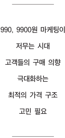 고객들의 구매 의사 결정에서 가격은 매우 중요한 변수다. 하지만 많은 조직에서 가격 책정이 주먹구구식으로 이뤄지는 사례가 많다. 고객들의 구매 의향을 극대화하면서 여러 다양한 상품 옵션들 중 조직의 목적 달성에 가장 도움을 주는 최적의 가격 구조를 고민해봐야 한다. 특히 상위 제품 옵션의 판매가 매우 중요한 경우라면 9900원 가격 전략은 신중하게 접근해야 한다.