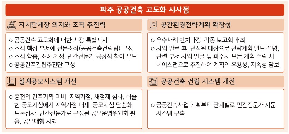 파주시 공공건축건립추진단 관계자는 “공공건축 고도화 추진으로 우수한 디자인의 공공건축물을 선정한 결과 2021 대한민국 공공건축상 혁신행정부문을 수상하는 등 성과를 내고 있다”며 “향후 지속적인 설계공모 시스템 개선과 공공사업 질적 향상을 위한 자문·방향을 적극 검토해 실효성 높은 정책으로 확대·계승해 나아가고, 이를 통해 정책 목표였던 ‘헤이리 예술마을’과 ‘파주출판도시’와 함께 파주 공공건축이 어우러지는 ‘건축이 아름다운 도시 파주’의 모습을 만들고자 한다”고 전했다.