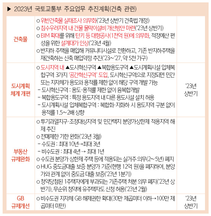 정부가 공공안전 확보를 위한 ‘위반건축물 실태조사 의무화’를 추진한다. 상반기 건축법을 개정해 지자체 자율에 맡겨둔 실태조사를 의무 시행되도록 해 실효성을 강화한다는 계획이다. 또 도시계획체계를 개편해 고밀융복합시설 개발을 활성화한다. 도시지역 내 ▲도시혁신구역 ▲복합용도구역 ▲도시계획시설 입체복합구역 3가지 종류의 ‘공간혁신구역’을 도입해 민간이 기존 도시계획 규제에 얽매이지 않고 특정 지역에 업무시설, 호텔, 아파트, 병원 등이 어우러진 초고층 복합단지를 개발할 수 있게 된다. 국토교통부는 새해 이 같은 업무계획을 밝혔다. 본지가 1월 3일 발표된 국토교통부 2023년 주요업무 추진계획 중 건축 관련 내용을 정리해봤다.