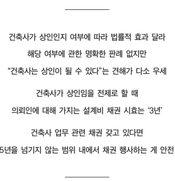 아직 건축사의 상인성에 대한 명확한 판례는 없지만, 필자의 견해와 같이 건축사는 상인이 될 수 있다는 견해가 다소 우세하므로 부디 건축사님들이 조금이라도 건축사 업무에 관련이 있는 채권을 가지고 있을 때에는 5년을 넘기지 않는 범위 내에서 채권을 행사하시는 것이 안전하다고 말씀드리겠습니다. 물론 설계대금 채권은 그 소멸시효가 5년이 아니고 민법 제163조 제3호에 의하여 3년의 단기 시효가 적용되므로 더욱 유의하셔야 할 것입니다.