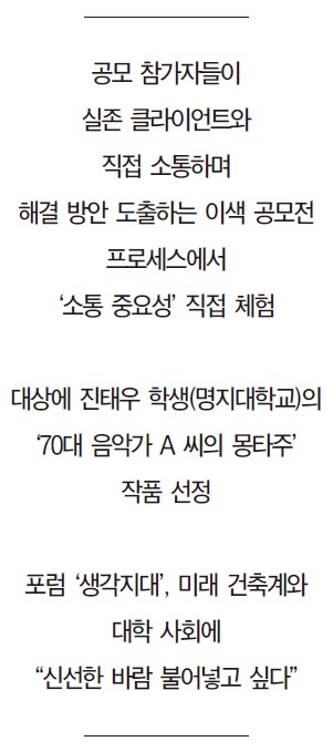 지난 2월 18일 포럼 ‘생각지대’에서 주관한 공모전 ‘Be my Qlient’ 시상식이 개최됐다. ‘Be my Qlient’는 여러 조건이 동일하게 주어지는 일반 공모전과 달리, 참가자들이 실존하는 클라이언트와의 직접 소통을 통해 해결 방안을 도출함으로써 프로세스에서의 소통의 중요성을 직접 체험할 수 있었다는 차별성을 갖는다. 이번 공모전의 클라이언트는 은퇴한 원로 음악가로, 70대를 맞이한 본인의 생의 마지막 집인 ‘죽음의 집’이라는 주제를 설정했다.