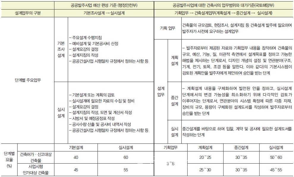 ‘기본조사설계’와 ‘실시설계’로 분류된 예산편성 기준이 소관 부처의 고시내용과 어긋나면서 유기적으로 운영되어야 할 행정체계에 혼란을 부추기고 있다. 용어상으로는 '기본조사설계'는 ‘기획업무’와 ‘계획설계’ 를, ‘실시설계’는 ‘중간설계’와 ‘실시설계’를 의미하는 것 같지만 해당 단계의 업무내용은 그렇지 않다. 단계 별 업무에 대한 대가요율도 마찬가지다. 설계업무와 분리된 기획업무에 대한 대가는 반영되지 않았고 요율로 봐서는 ‘중간설계’는 ‘기본조사설계’에 포함되어 있다. 특히 ‘실시설계’ 용어 설명에서 언급된 ‘기본설계 또는 계획의 검토’는 문구 해석에 대한 의견이 분분하다. ‘기본조사설계’ 항목에 계획설계와 중간설계에 관련된 설명이 전혀 없는 상황에서 이 문구에 의해 해석의 오류를 낳고 있다. 즉 실시설계 단계에 계획설계와 중간설계에 준하는 업무를 요구하는 상황이 벌어지고 있다. 교육청 발주 사업이 대표적인 사례다. 결국 이에 대한 설계대가는 사라졌다.