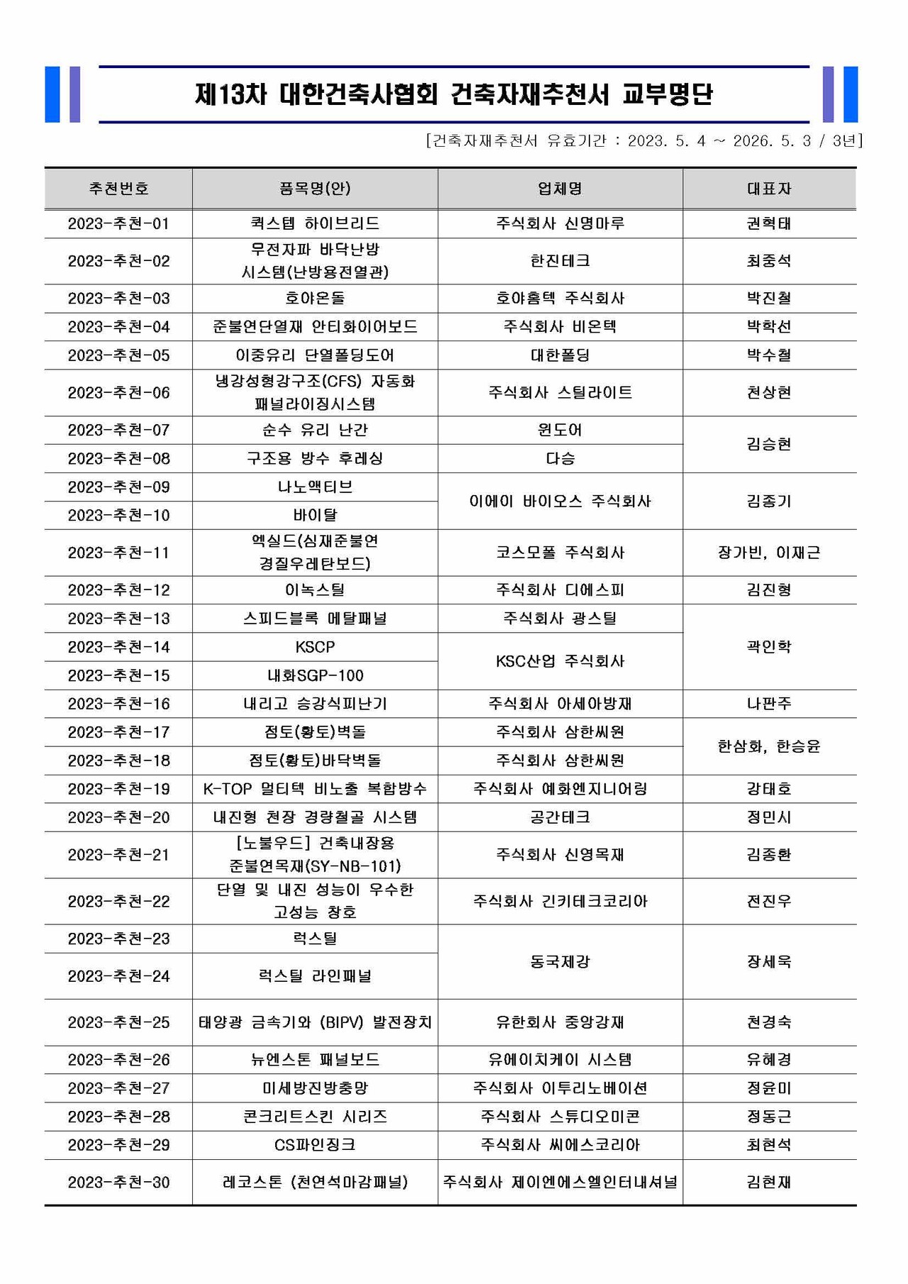 지난 3월 20일 발표된 제13차 건축자재 추천 목록은 심사를 거쳐 26개 사의 30개 품목이 선정됐다. 건축자재 추천 목록은 누리집(www.kira.or.kr)을 통해 확인할 수 있다.