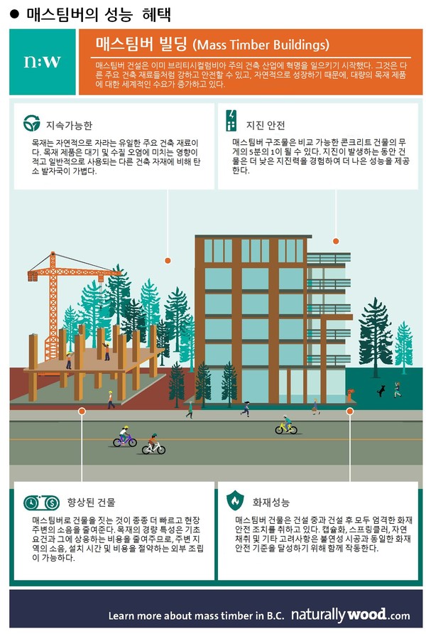 최근 대안으로 매스팀버(Mass Timber)가 주목받고 있다. 이유로 ①목재는 생물학적 탄소순환의 반복으로 얻는 녹색 순환형 재생산의 재료이므로 탄소발자국을 남기지 않는다. ②기존 콘크리트 건물 무게의 5분의 1 정도로 가볍지만 지진에 강하고, 그에 상응하는 기초공사비도 줄일 수 있다. ③다른 건설 방법보다 빠르고, 현장 주변 소음과 폐기물 생성을 줄여준다. ④화재 안전기준을 만족하고 있기 때문이다.