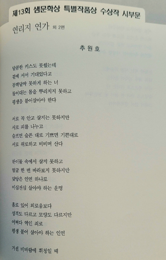 건축사로서 시문학에 열정을 쏟고 있는 추원호 건축사(건축사사무소 신세대그룹)가 4월 22일 서울시 중랑구민회관에서 열린 샘문시선 주관 ‘2023년 신춘문예 제13회 샘문학상’에서 연리지 연가 외 2편(햇님 바라기, 가을의 향기)으로 ‘특별작품상’을 수상했다.