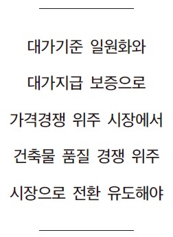 이 같은 제도개선 배경에는 민간 건축물 대가기준 부재로 인한 과당경쟁, 저가수주에 따른 건축물의 안전과 품질 저하, 그리고 대가 관련 소송 등으로 인한 사회적 비용 증가가 자리 잡고 있다. 2009년 ‘건축사 용역의 범위와 대가기준’이 폐지돼 ‘공공발주사업에 대한 건축사의 업무범위와 대가기준’이 운용되고 있으나, 당초 정책 목표와는 달리 건축시장의 생태계 혼란이 발생하고 있어 이를 보완할 대책이 필요한 형편이다.