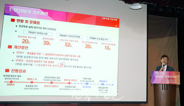 2023년도 협회발전 임원연수회에서 발표된 ‘2023 법제도개선 중점 추진과제’는 현재 협회가 주력해 제도개선을 추진 중인 사안으로, 전국 17개 시도건축사회 건의사항과 회원들의 제도개선 요청이 반영된 것이다. 특히 이들 과제 중 ‘민간대가 기준 마련’은 연구결과에 따른 검증회의를 갖는 등 정부·관계기관과 협의를 마치고 현재 이를 위한 입법이 곧 가시화될 예정이다. 이날 과제 설명을 맡은 정태화 부회장은 “힘을 합해 뜻을 모은다면 과제들 모두 하나하나 해결해 나갈 수 있으리라 기대한다”며 “제도개선을 마무리하는데 최선을 다할 계획”이라고 강조했다.