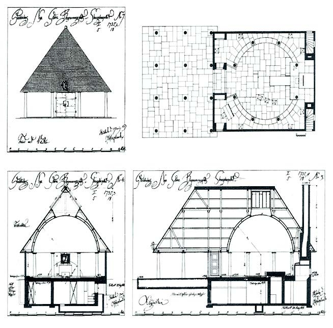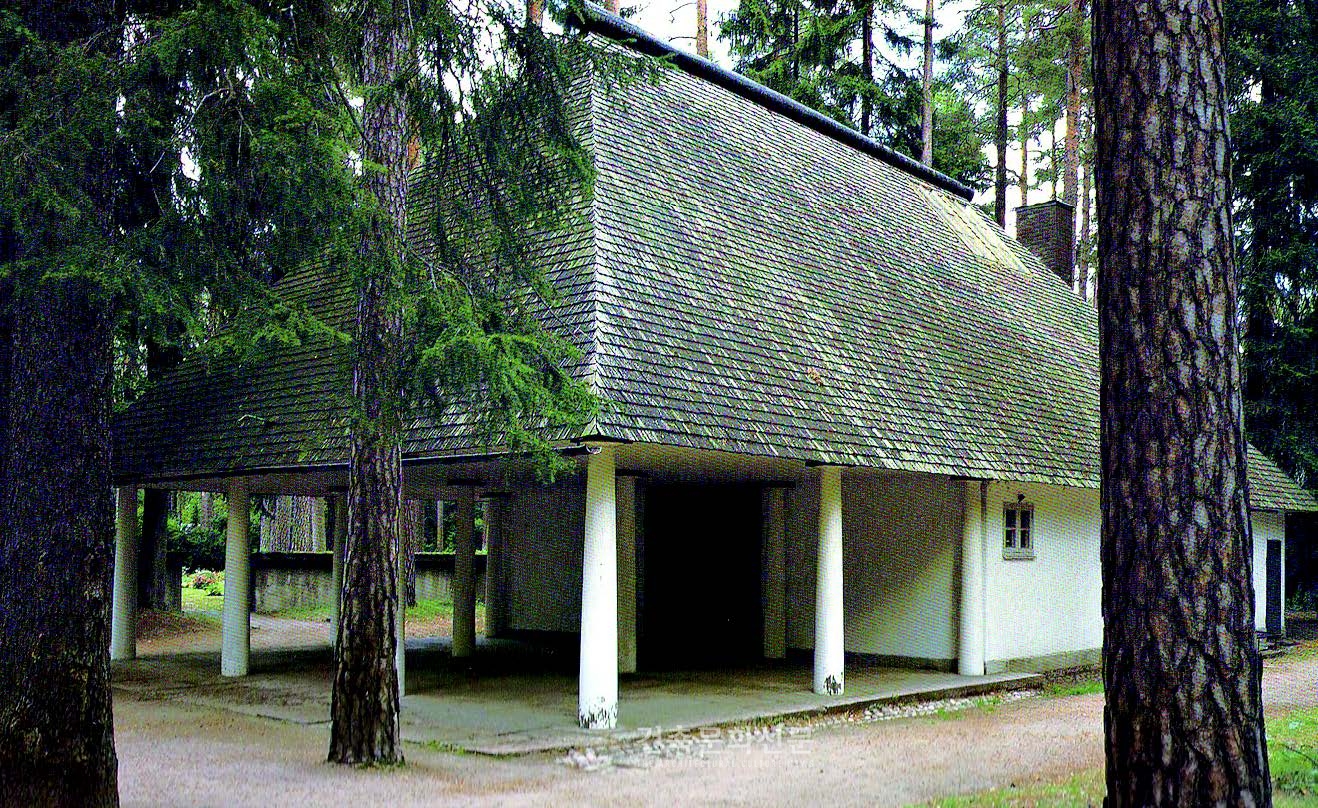 스톡홀름 우드랜드 공동묘지(1915~61)의 침엽수림에 자리한 이 ‘숲속 예배당’은 우선 그 아담한 크기(전체 높이는 8m에 이르나 지붕을 제외한 포티코는 약 2.3m)로부터 자연에 순응하려는 겸허함을 볼 수 있다. 또한 큰 구배의 우진각지붕, 정면의 도릭 기둥 포티코, 그리고 이들이 만들어내는 피라미드형 정면 파사드가 첫인상을 좌우한다. 파사드는 고전건축의 페디먼트를 암시하기도 하고, 건축의 원형(archetype)에 대한 향수도 불러일으키는데, 매듭 없는 지붕 매스는 기하학적 순도가 높다. 그러나 직접적으로는 아스플룬트가 참조했던 덴마크 리젤룬트의 토착농가(1792~95)를 연상시키며, 지붕의 나무널 역시 토착성을 발현한다. 포티코의 목재 도릭 기둥은 주초와 플루팅 없이 얇은 주두만을 갖는 단순한 형식으로, 고전 규범 이전의 원초적 단계를 보여주는 듯하다. 석재의 바닥패턴으로 이어지는 실내는 외부와 완전히 다른 세계다. 외부 이미지가 토착의 투박한 맛을 간직했다면 내부는 정제된 고전의 우아함을 자랑하기 때문이다.