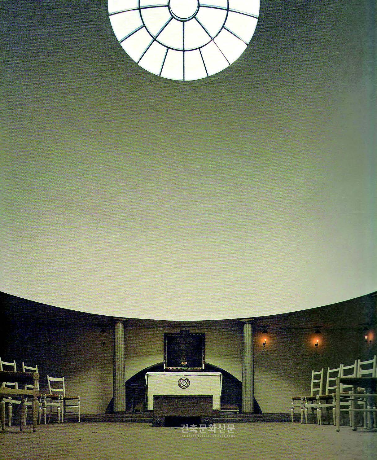 사각형 평면의 실내 공간은 백색의 돔으로 지배되며, 포티코에서 그렇듯 어떠한 수평돌림띠 없이 바로 기둥에 의해 지지된다. 미끈한 플라스터 마감이 거칠게 처리된 바깥의 지붕과 대비되고, 내부의 도릭 기둥은 플루팅과 주두의 조각, 바닥의 돌림띠가 도색되어 외부의 원시적 사촌들보다 더 진화된 듯한 환상을 갖게 한다. 실내는 돔 정점의 둥근 천창이 밝히는데, 전체 구도가 로마의 판테온과 닮았지만 규모의 친밀성과 마감의 온건함으로 긴장감은 훨씬 이완된다.하지만 우드랜드 채플의 실내에서는 전제됐던 토착건축의 구축논리가 모호해진다. 특히 돔은 하중이 전달되는 방식을 적절히 드러내고 있지 않은데, 부드러운 백색 곡면과 천창에서 유입되는 빛은 서로 어우러져 그 구조와 공간의 물성마저 소거해버린다. 단면도에서 알 수 있듯, 실제로 이 반구(半球)는 지붕의 목조체계에 매달리는 형국이다. 분명 아스플룬트는 구축의 논리보다 지붕과 돔의 원초적 이미지를 우선시했음에 틀림없다. 이러한 모순이 해결되려면 신화의 개입이 필요하다. ‘석화된 목구조(petrified carpentry)’로도 설명되는 그리스 고전건축이 구축의 논리에 미학적, 혹은 신화적 가공을 덧입었음을 상기하자.) 여기서 신화란 구조와 기능의 현실적 문제를 뛰어넘어 무목적의 가치마저도 창출하는 (그러나 칸트적 견해에서는 무목적의 목적을 지니는) 미학적이고 시적인 힘이라 하겠다. 이는 땅의 혼을 섭취한 쉘터가 품는 거주의 존재론적 신화로서 건축의 기원에 관한 신화를 환기시키기도 한다. 더불어 이 채플의 존재 근거인 죽음과의 대면을 생각해보라. 망자를 애도하며 떠나보내는, 삶과 죽음이 교차하는 이 공간은 부활에 대한 소망이 움트는 기독교적 신화이자 실화의 장이다. 이러한 신화적 가공이야말로 우드랜드 채플을 현실적 속박에 가두지 않으며, 천상의 시를 꿈꿀만한 기념비로 상승시킨다. 그리고 이를 재토착화된 고전이자 전설로 남게 한다. 우드랜드 채플이 시대와 장소를 초월해 울림을 주는 까닭이 바로 여기 있다.