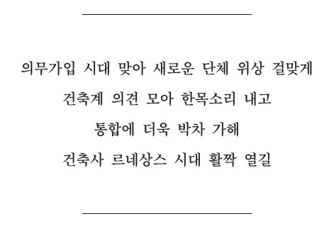 한편, 협회 내적으로는 재정 건전성 확보를 위한 추대회원 증가에 따른 대안 모색 등 회비제도 개선, 신 수익원 개발, 출판사업, 회원 아카이브 라운지 조성 등 변화된 모습으로 건축사 통합단체로서의 면모를 갖춰야 한다. 건축사에 대한 대국민 인식을 제고하기 위해 유튜브를 통한 건축전문방송 송출과 함께 저작권보호센터의 운영 역시 필요하다. 지난 몇 년간 의무가입 완성을 비롯한 현안 해결을 위한 노력이 수포로 돌아가지 않도록 일부 건축사들의 반발 의견도 겸허히 수용해야 하며, 서로 간 조금씩 양보하는 자세 역시 갖춰야 한다. 이제 의무가입 시대가 본격 도래한 것을 계기로, 통합에 더욱 박차를 가하고, 협회가 건축사 르네상스 시대를 활짝 열 수 있기를 간절히 희망한다.