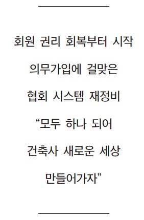 이어 의무가입 시대를 맞아 변화와 개혁에 대한 주문도 내놨다. 석정훈 회장은 “의무가입은 건축사에게 변화하고 혁신하도록 요구하고 있다”며 “건축사도, 협회도, 건축계도 모두 변해야만 한다. 변해야만 개혁할 수 있고 개혁해야만 새로운 질서, 새로운 세상을 만들어 낼 수 있다”고 전했다. 이를 위해 회원 권리 회복부터 시작해 의무가입에 걸맞은 협회 시스템을 재정비할 것임을 강조했다.