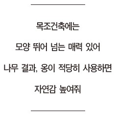 일본을 대표하는 건축가 쿠마켄코(隈研吾)는 목재를 통해 인간 뿌리의 가설을 찾고 있다. 그는 “나무를 사용하면 그 자체로 여느 때와 다른 공간이 된다는 것을 발견했습니다. 건축이란 형태라고 배웠지만, 목조건축에는 모양을 뛰어넘는 매력이 있습니다. 그것은 질감일 수도 있고 직접적으로 인간의 몸에 와닿는 무언가일 수도 있습니다. 천이나 돌과 같은 물질과는 확연하게 다른 생물이 있다는 느낌이 듭니다. 목재를 사랑할수록 같은 생물끼리의 대화가 서로 통하지 않을까 생각합니다.”1)라고 경험에서 얻은 가설을 정리하고 있다.