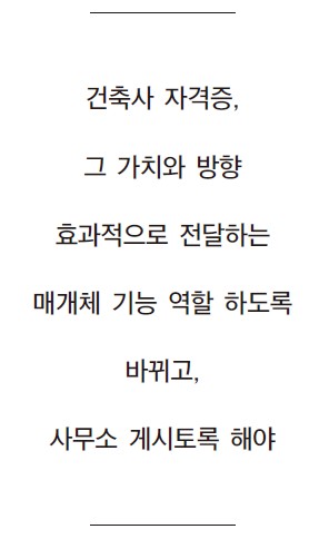 지난해 건축사 자격을 취득한 B 건축사는 “건축사가 건축 설계를 통해 사는 사람의 삶을 건축물에 자연스럽게 녹아들게 해 삶을 디자인하는 것처럼, 창의적 직업군에 맞게 자격증이 그 가치와 방향을 효과적으로 전달하는 매개체 기능을 할 수 있도록 바뀌었으면 한다”고 주문했다.