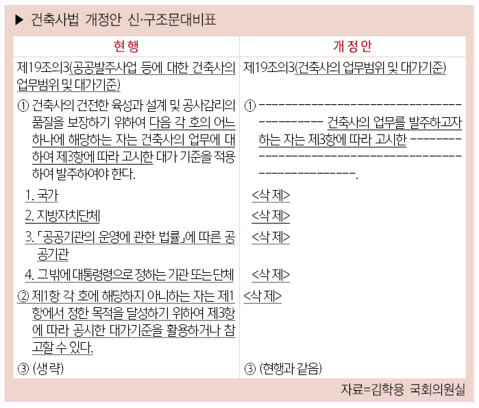 김학용 국회의원실에 따르면, 건축사법 개정안에는 공공발주 건축사업무로만 한정되어 있는 건축사 업무대가 기준을 공공과 민간 공히 적용할 수 있도록 ‘건축사의 업무범위 및 대가기준’으로 개정하는 내용이 포함됐다.