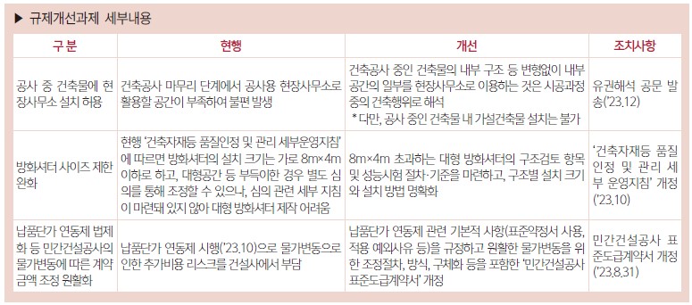 앞으로 공사 중인 건축물의 내부 구조 등 변형 없이 내부 공간의 일부를 현장사무소로 이용할 수 있게 된다. 또 8m×4m를 초과하는 대형 방화셔터의 구조검토 항목 및 성능시험 절차·기준이 마련돼, 구조별 설치 크기와 설치 방법이 명확해진다.