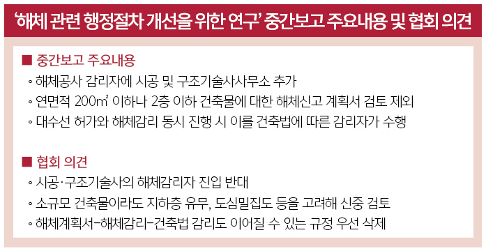 협회에 따르면, 경상국립대학교가 수행 중인 연구용역 중간 결과에는 ▲해체공사 감리자에 시공 및 건축구조기술사사무소 추가 ▲연면적 200㎡ 이하나 2층 이하 건축물에 대한 해체신고 계획서 검토 제외 ▲대수선 허가와 해체감리 동시 진행 때 건축법에 따른 감리자가 이를 수행하는 내용이 수록된 것으로 알려졌다.