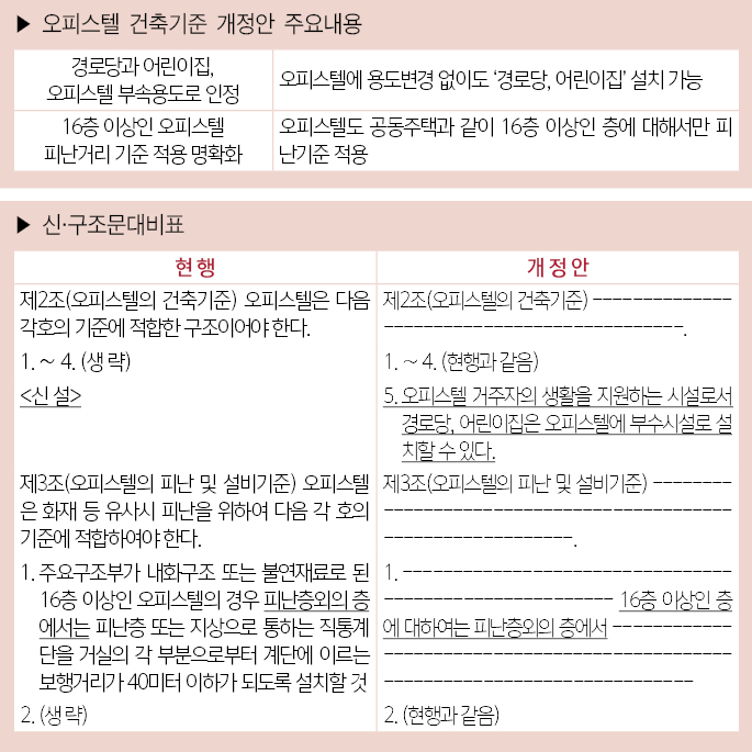 국토교통부는 경로당, 어린이집을 오피스텔 부속용도로 인정, 용도변경 없이도 설치할 수 있도록 하는 ‘오피스텔 건축기준’을 12월 13일 개정, 고시 발령한 날부터 시행한다고 밝혔다. 오피스텔에 거주 중인 취약계층의 주거 편의를 증진하기 위함이라는 게 국토부의 설명이다.