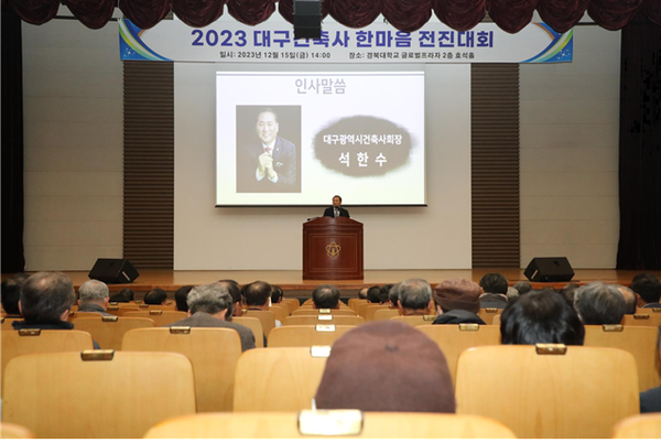대구광역시건축사회는 12월 15일 경북대 글로벌플라자 2층 효석홀에서 회원 483명이 참석한 가운데 ‘2023 대구건축사 한마음 전진대회’를 개최했다. 이날 행사는 윤리교육과 협회 주요 현안에 대해 설명하는 시간으로 꾸며졌다.