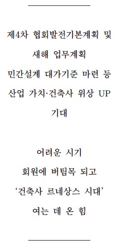 올해는 업계를 옥죄는 임의규제, 불합리한 제도를 개선하기 위한 움직임도 본격화될 전망이다. 특히 총괄조정자와 총괄조정 업무에 대한 용어 정의, 그리고 총괄조정 업무내용과 권한 규정, 대가기준을 마련하는 건축법 개정과 더불어 건축사업무의 책임한계와 면책기준을 법제화하는 데 힘을 쏟을 방침이다.
