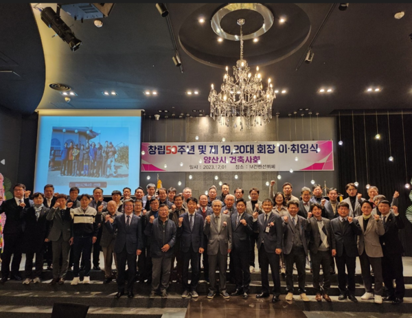 경상남도건축사회 양산시지역건축사회는 지난해 12월 1일 양산시지역건축사회 창립 50주년 기념행사 및 제19·20대 회장 이·취임식을 진행했다. 새로 취임한 황성태 회장은 “소통과 변화로 양산시지역건축사회의 밝은 미래를 위해 나아가겠다”고 포부를 밝혔다. 한편, 20대 회장 임기는 2024년 1월 1일부터 시작된다.