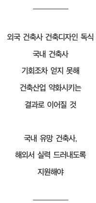 문화는 돌고 돌면서 서로에게 영향력을 끼치며 고유한 지역의 가치를 발전시켜 왔다. 외국건축사들의 작품이 국내에도 셀 수 없이 많아지고 있는 실정이다. 선기능의 측면도 있지만 이는 국내 건축산업을 약화시키는 결과로 이어질 수밖에 없다. 국내 건축사를 배제하고 유명외국 문화를 숭배하는 문화사대주의의 바탕 위에 한국의 공간과 건축사들은 기회조차 얻지 못한다.