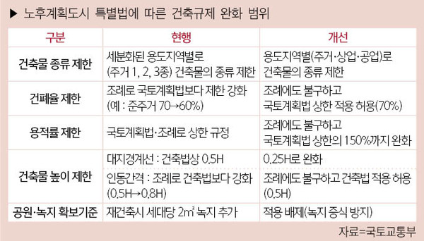 노후계획도시 특별법 적용지에 대한 정의가 조성 후 20년 이상 경과한 택지에 인접·연접한 지역을 포함하고, 노후계획도시법에 있던 단일택지개발지구 100만제곱미터 이상인 지역으로 구체화됐다. 해당 지역은 용적률이 법정 상한의 150%까지 상향, 건폐율과 인동간격은 국토계획법과 건축법 상한까지 완화된다.