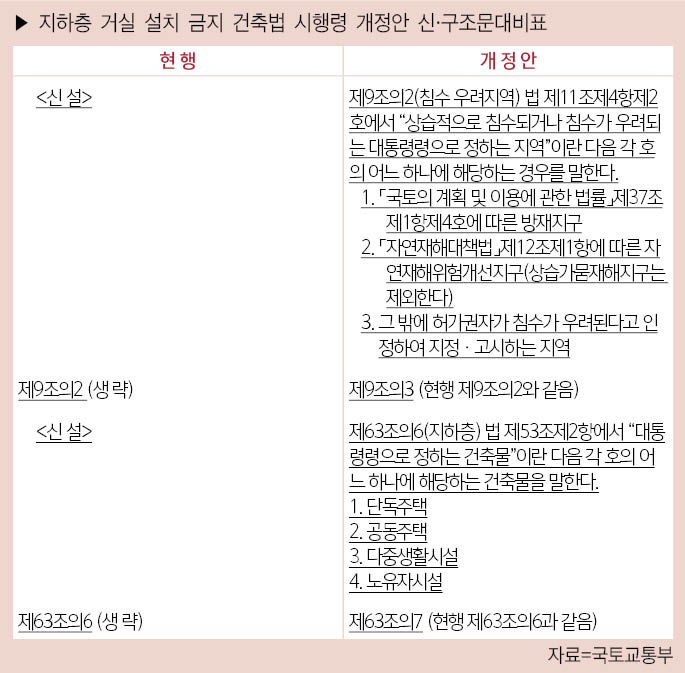 국토부는 비정상 거처 등을 고려해 건축법에 명시된 취약계층 등이 거주하는 ▲단독주택 ▲공동주택 ▲다중생활시설 ▲노유자시설을 지하층 거실 설치가 제한되는 건축물로 규정했다. 또 시행령은 방재지구, 자연재해위험개선지구, 그 밖에 허가권자가 침수가 우려된다고 인정하여 지정·고시하는 지역을 침수 우려지역으로 지정했다.