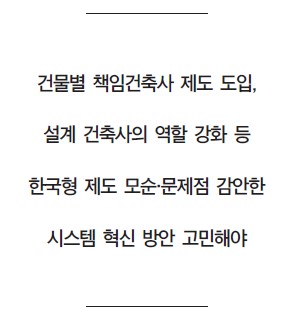 이런 몇 가지 내용들이 반영될 때 우리나라 건축은 안전을 확보하면서 세계적 건축수준으로 어깨를 나란히 할 수 있다. K-건축의 발전은 절대 저절로 되는 것이 아니다.