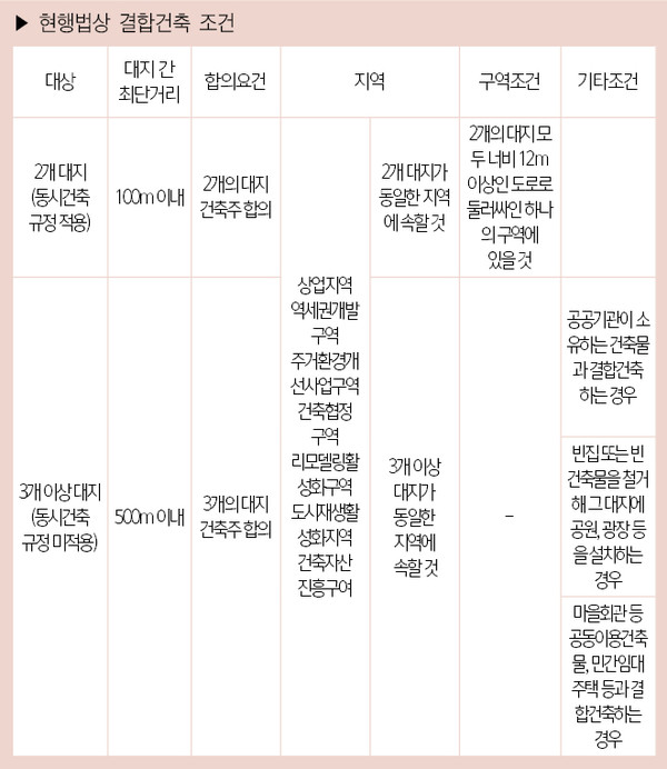 결합건축 제도의 활용이 저조한 원인으로는 대상지 부족, 거리 규정, 동시 건축 규정 등이 꼽힌다. 결합건축이 가능한 지역은 건축법 제77조의15 제1항 및 동법 시행령 제111조에 따라 8곳이다. ▲상업지역 ▲역세권의 개발 및 이용에 관한 법률에 따라 지정된 역세권개발구역 ▲도시 및 주거환경정비법에 따른 정비구역 중 주거환경개선사업구역 ▲건축협정구역 ▲특별건축구역 ▲리모델링 활성화 구역 ▲도시재생 활성화 및 지원에 관한 특별법에 따른 도시재생활성화지역 ▲한옥 등 건축자산의 진흥에 관한 법률에 따른 건축자산 진흥구역 등이다.