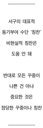 김 교수는 “정당하지 않은 칭찬은 사람의 멘탈을 약하게 만들고, 삶에 대한 동기를 잃게 만들 수 있다. 과장된 칭찬은 사랑도 아니고 배려도 아니며 그냥 좋은 사람으로 남고 싶은 어설픈 이기심일 수 있다”고 지적한다. 꾸중이든 칭찬이든 모두 정당해야 사람을 성장시킬 수 있다는 점을 잊어서는 안 되겠다.