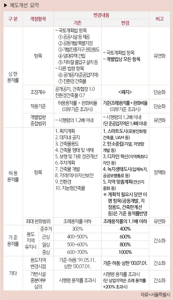 또한 지구단위계획구역에서 기존에 하향 조정되던 기준용적률 규정은 폐지되고, 기준용적률이 조례용적률과 동일하게 적용된다. 일반적 항목은 기준용적률 범위에서 의무 이행되며, 미래도시정책·공공성 항목 도입 시 최대 110%까지 상향된 인센티브가 제공된다.