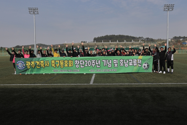 광주건축사축구동호회(회장 이철)가 2004년 2월 설립 후 20주년을 맞이해 지난 4월 6일 영광스포티움 축구장에서 ‘창립 20주년 기념식 및 호남교류전’을 개최했다. 개최식에는 광주시건축사회 강필서 회장, 전남건축사회 이경일 회장, 광주축구동호회, 전남축구동호회, 강남축구동호회, 대전축구동호회 회원 등 총 46명이 참석했다.