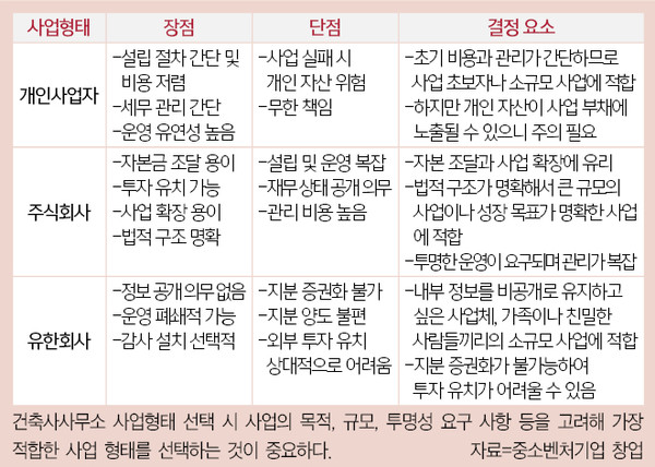 아름세무법인 관계자는 “건축사사무소를 창업할 때 개인사업자로 시작하면 설립 절차가 간단하고 비용이 적게 들며, 운영의 유연성이 높다. 그러나 사업 실패 시 개인 자산이 위험에 노출될 수 있다. 주식회사는 자본금 조달이 용이하고 법인의 재무구조를 공개해야 하지만, 사업주의 개인 자산을 보호하는 장점이 있다. 유한회사는 주식회사보다 더 폐쇄적으로 운영되지만, 정보 공개 의무가 적다. 각 형태의 특성을 고려해 사업을 진행해야 한다”고 조언했다.