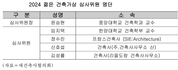 문화체육관광부가 주최하고 (사)새건축사협의회, (사)한국건축가협회, (사)한국여성건축가협회가 공동으로 주관하는 2024년 ‘젊은 건축가상’이 5월 2일부터 공모에 들어간다.