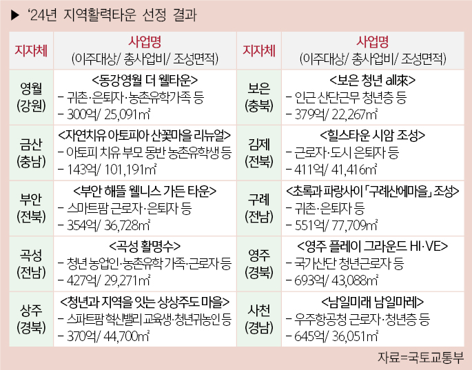 국토교통부를 비롯해 교육부, 행정안전부, 문화체육관광부, 농림축산식품부, 보건복지부, 해양수산부, 중소벤처기업부 8개 부처가 협력해 2024년도 지역활력타운 공모 결과, 10개 지자체를 선정했다. 선정된 지역은 강원 영월, 충북 보은, 충남 금산, 전북 김제·부안, 전남 구례·곡성, 경북 영주·상주, 경남 사천이다.
