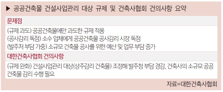 협회는 이러한 변경이 공공건축물에 과도한 규제로 작용하고 있으며, 특히 소규모 건축사사무소는 이러한 규정 때문에 공공 프로젝트의 감리 참여가 사실상 불가능한 형편이다. 자격을 충족하는 일부 소수 업체만이 공공건축물 공사감리 시장을 독점하는 문제도 지적된다. 현재 건설엔지니어링 사업자의 수는 452개에 불과하지만, 지난해 공공부문에서 신축된 660㎡ 이상 건축물은 3,626건에 달하는 상황이다.